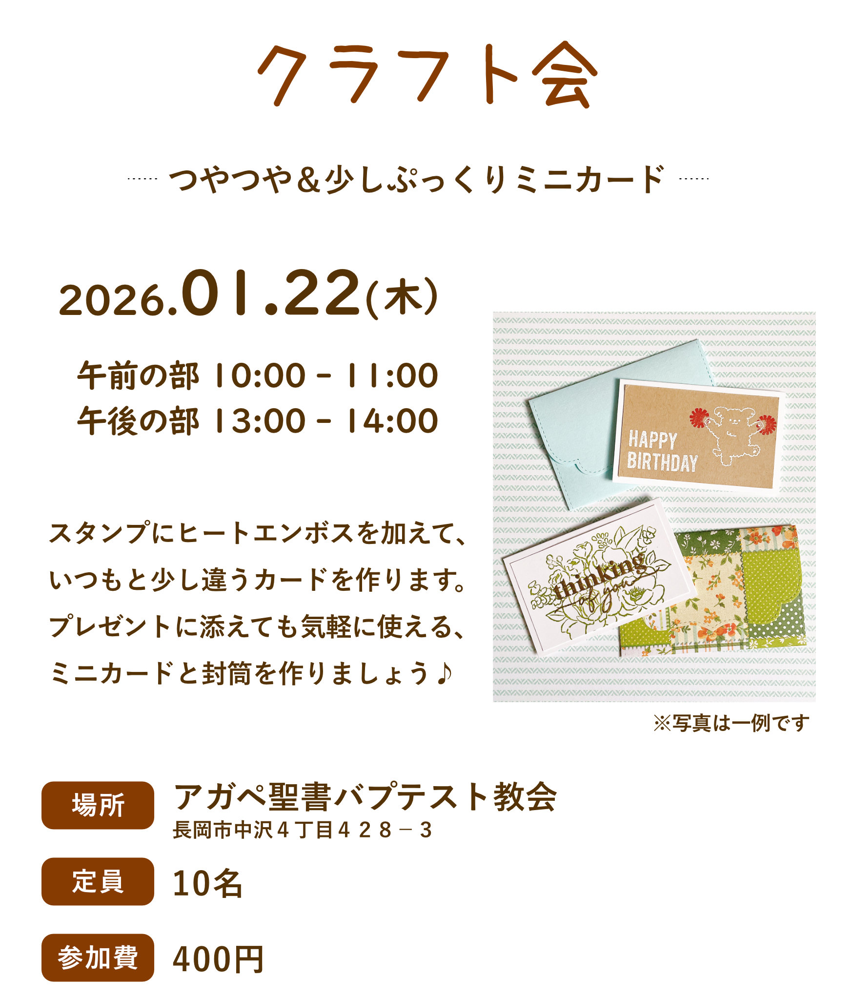 場所:アガペ聖書バプテスト教会(〒940-0853 長岡市中沢 4-428-3)